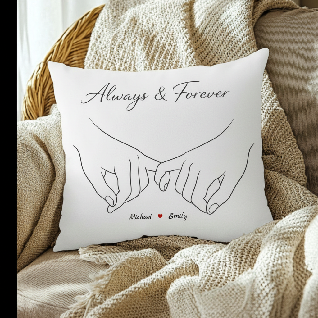 The Always & Forever throw pillow features minimalist line art of two hands gently intertwined, paired with optional personalization for a subtle, personal touch. Designed to blend seamlessly into any space, it adds warmth and meaning without overwhelming the room.